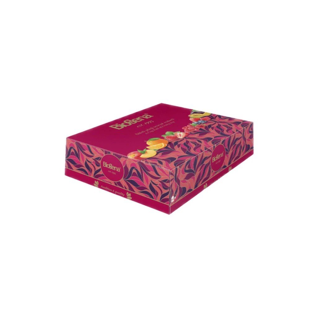 Dárková sada ovocných čajů Biogena Tradiční čaj Maxi obsahuje šest různých příchutí ovocných čajů po deseti sáčcích.