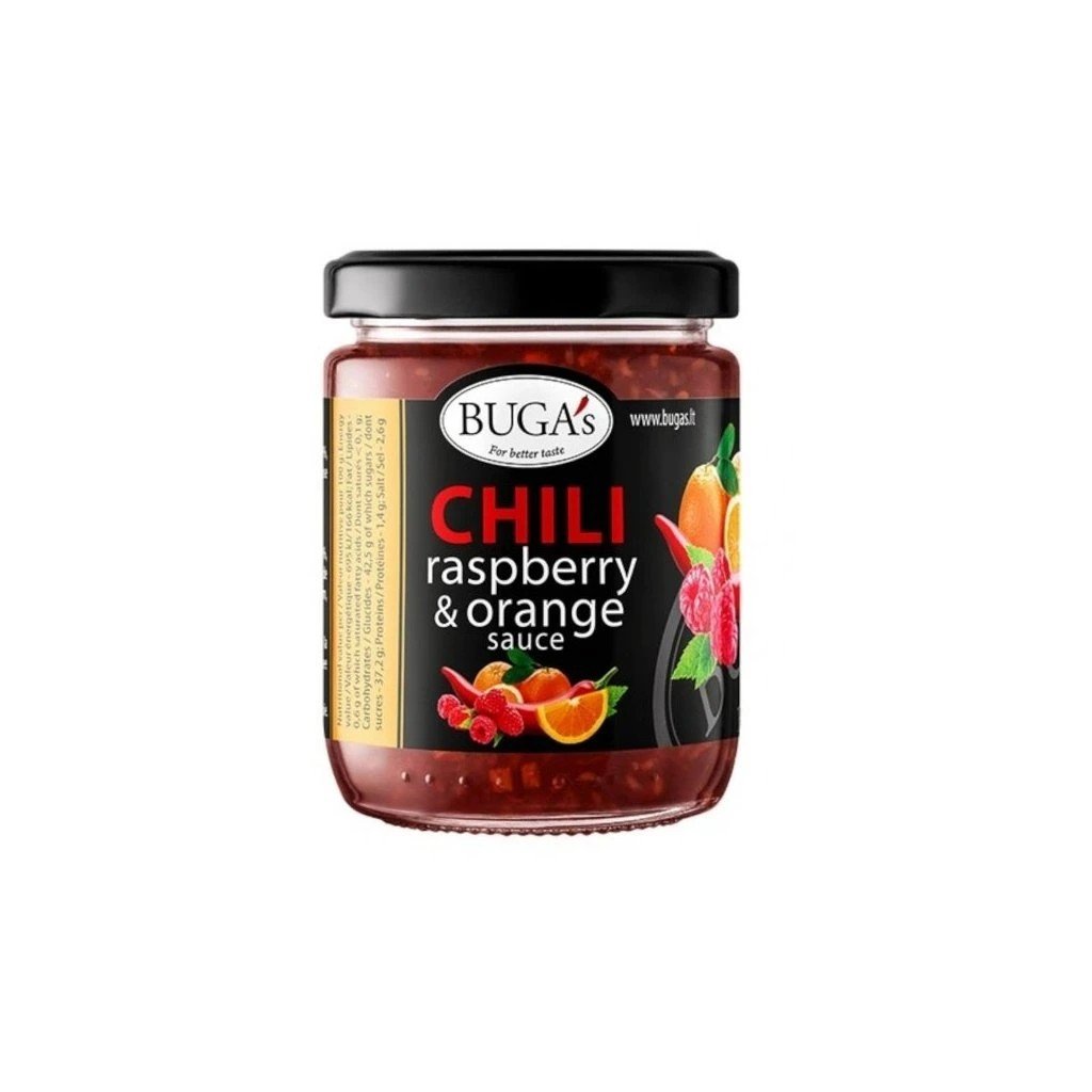 Buga´s Chilli omáčka s malinou a pomerančem 170g – pikantní a ovocná omáčka s jemnou chilli, malinami a pomerančem, ideální k masu, grilovaným pokrmům nebo sýrům.