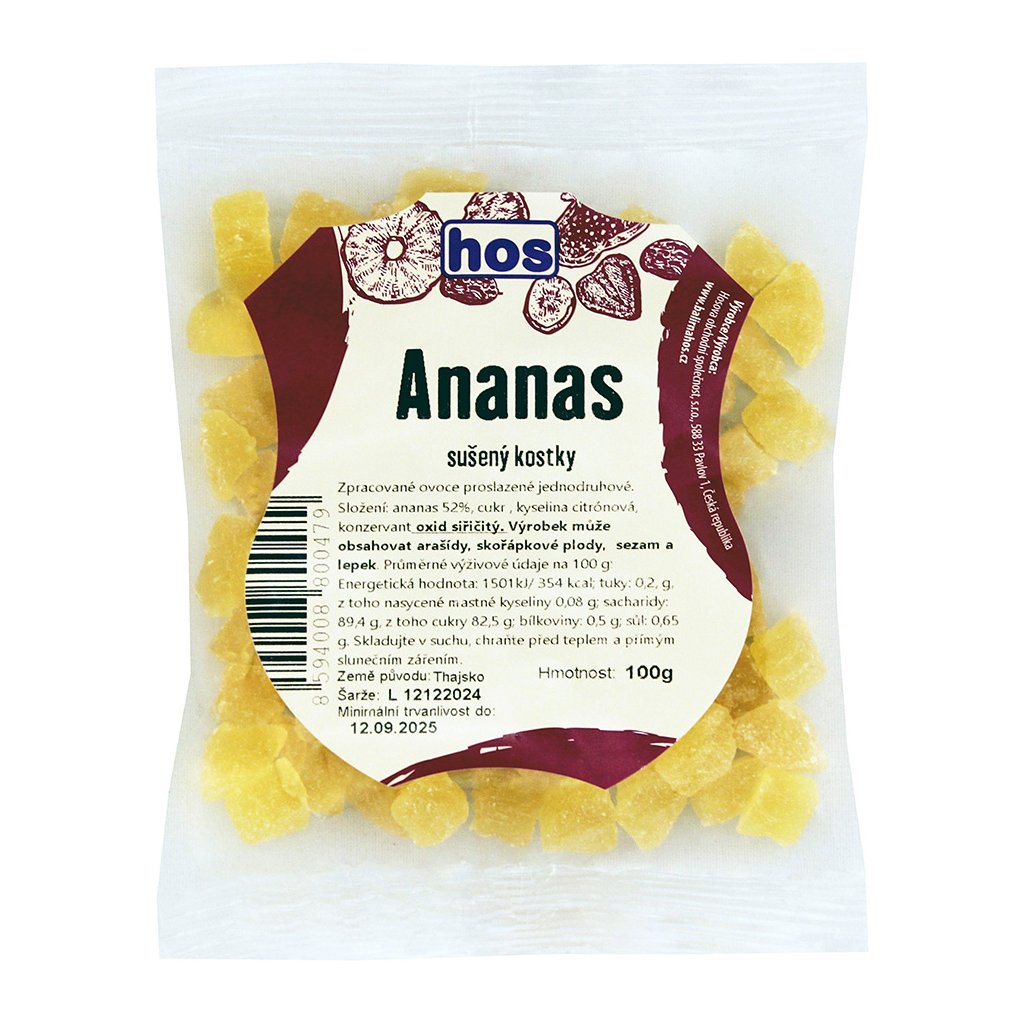 Proslazené jednodruhové sušené ovoce – ananasové kostky s lahodnou chutí, ideální k přímé konzumaci nebo do směsí s oříšky a jiným sušeným ovocem.
