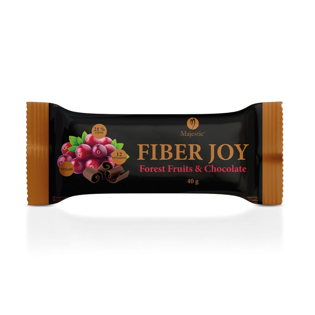 Majestic Ovocná tyčinka Fiber Joy lesní ovoce a čokoláda 40 g je chutná svačina s vysokým obsahem vlákniny z čekanky a směsí 12 vitamínů.