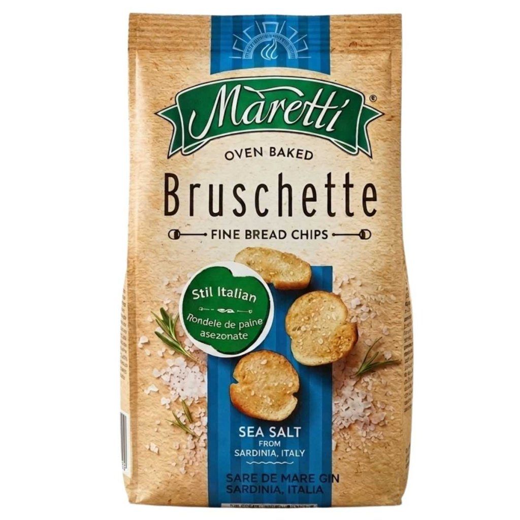 Maretti Bruschette pečené suchary s mořskou solí jsou křupavá italská svačinka pečená v troubě s jemnou chutí mořské soli, ideální k vínu, pivu nebo jen tak na chuť.