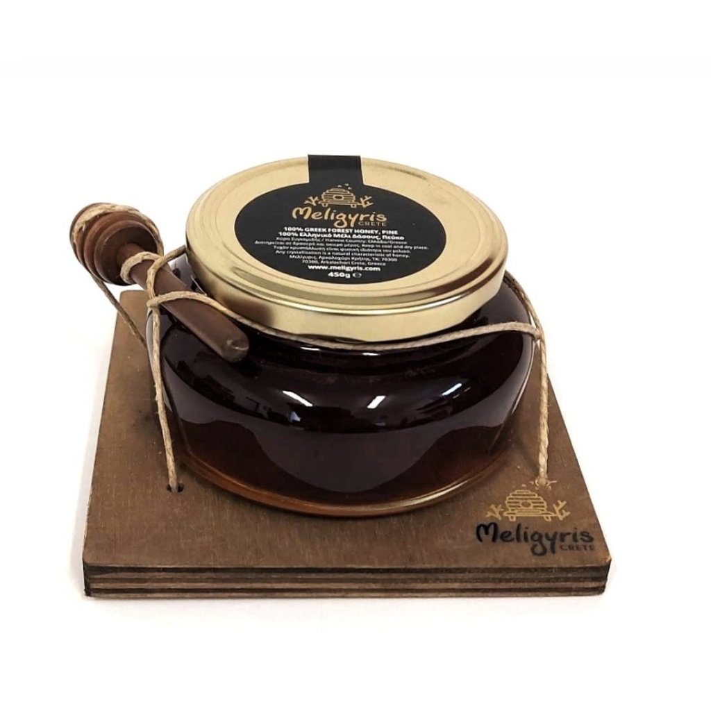 Luxusní řecký piniový med Meligyris (450g) je tmavý, aromatický a na minerály bohatý lesní med s pomalou krystalizací, dodávaný v elegantním dárkovém balení z olivového dřeva.