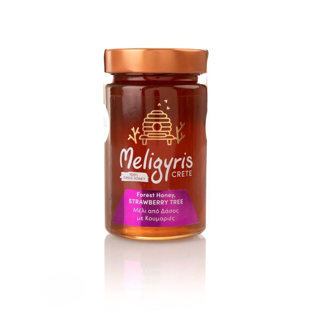 MELIGYRIS Řecký lesní med "Kumaria-planikový" 450g je unikátní med získávaný z nektaru květů keře planiky obecné (Arbutus unedo), známé také jako jahodový strom.