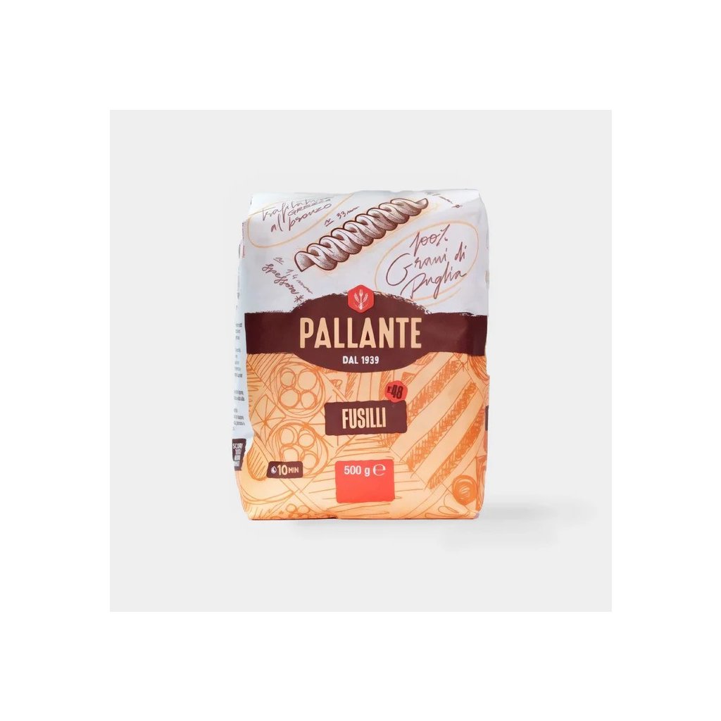 Pallante Fusilli n.48 500g jsou kvalitní italské šroubovité těstoviny z tvrdé pšenice se žebrováním, které výborně drží omáčku a chutě — ideální pro bohatá ragú, zeleninové směsi či sýrové a krémové pokrmy, které promění každý talíř v lahodný gastronomický zážitek.